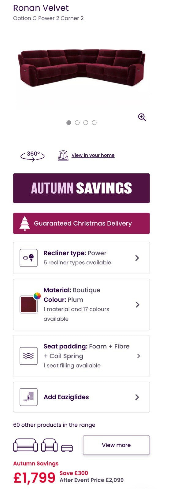 DFS Ronan Velvet Power Recliner Corner Sofa In Plum