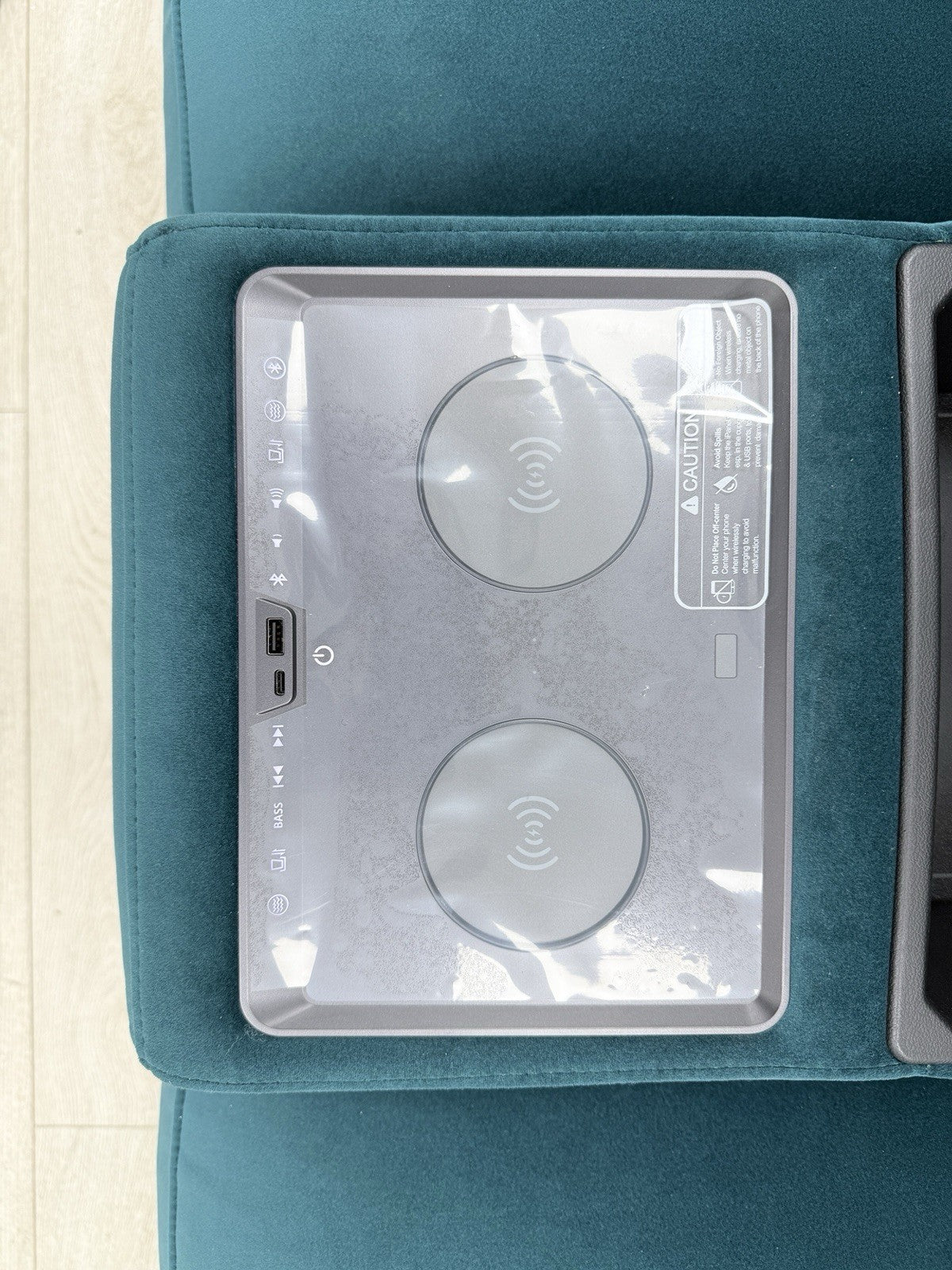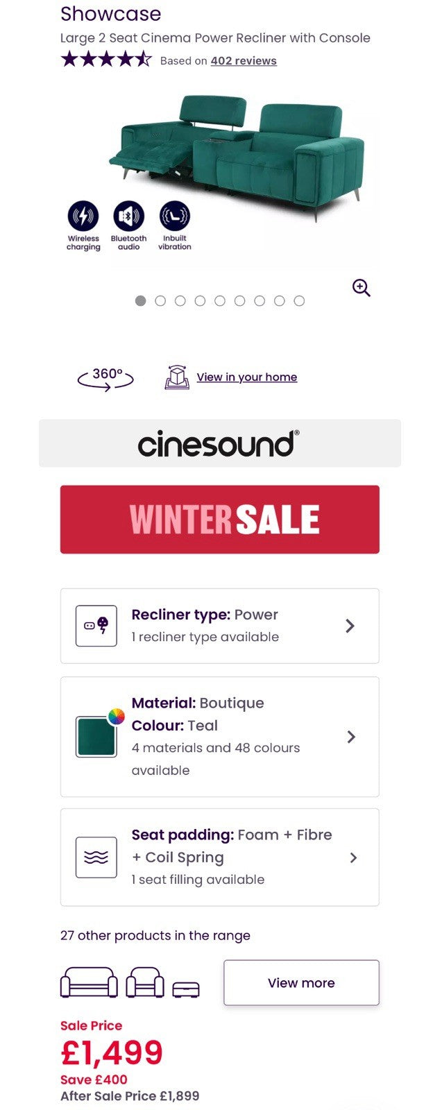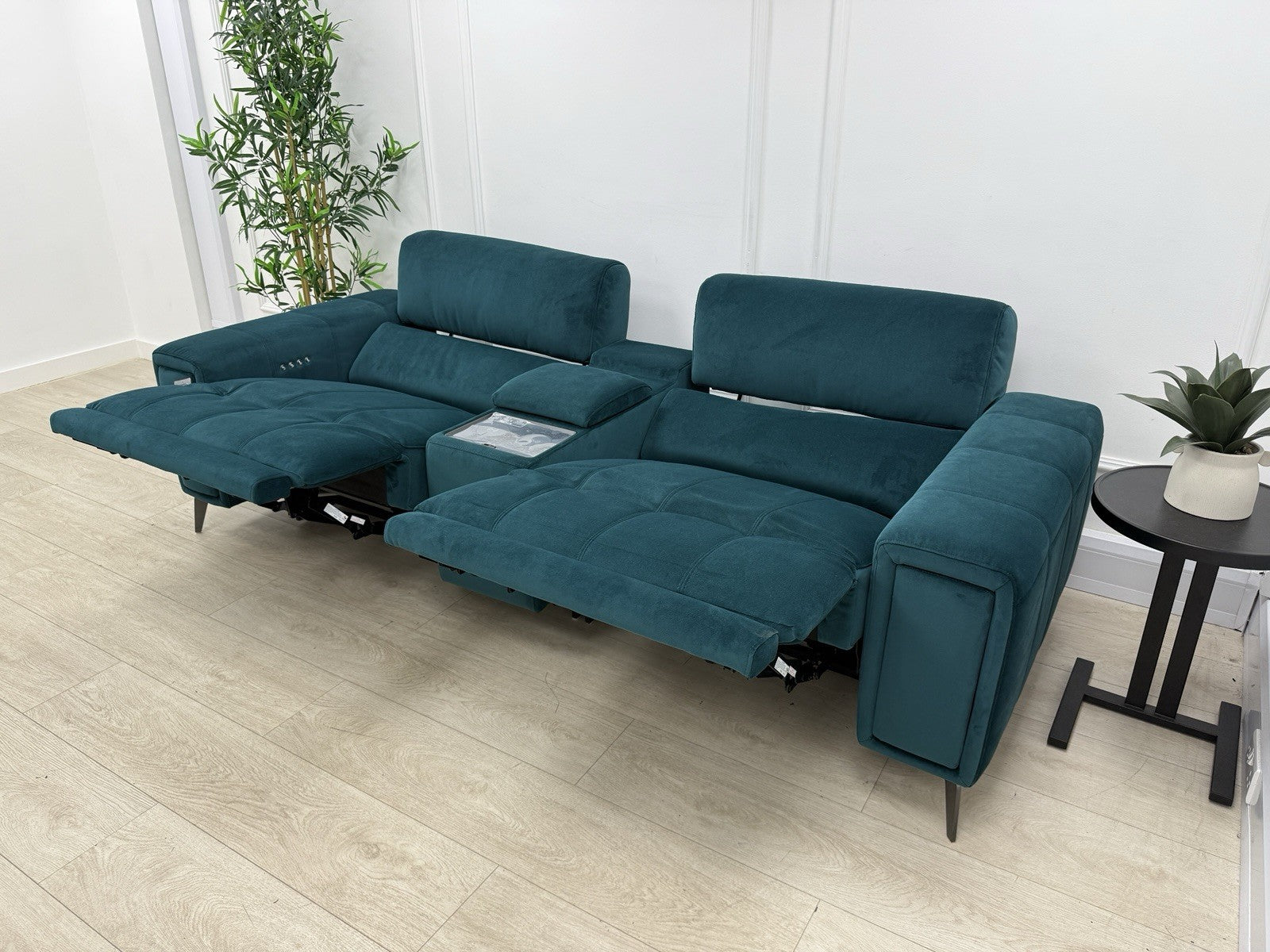 DFS Showcase Power Recliner 3 Seater Cinema Sofa In Teal Velvet Fabric