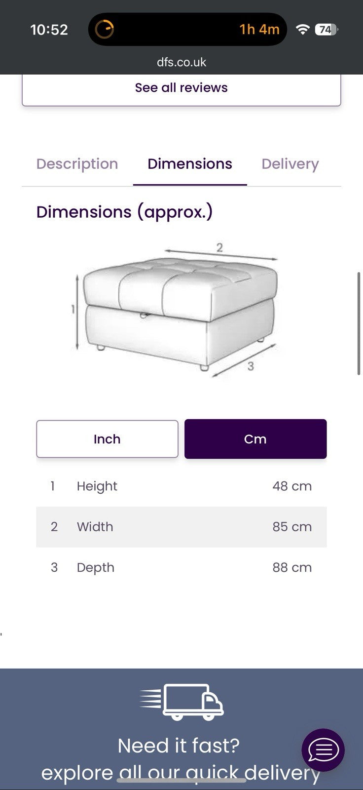 Delivery is usually within 3-5 working days. Same or next day delivery may be available subject to availability. Due to space limitations we cannot store sofas for longer than 1 week.