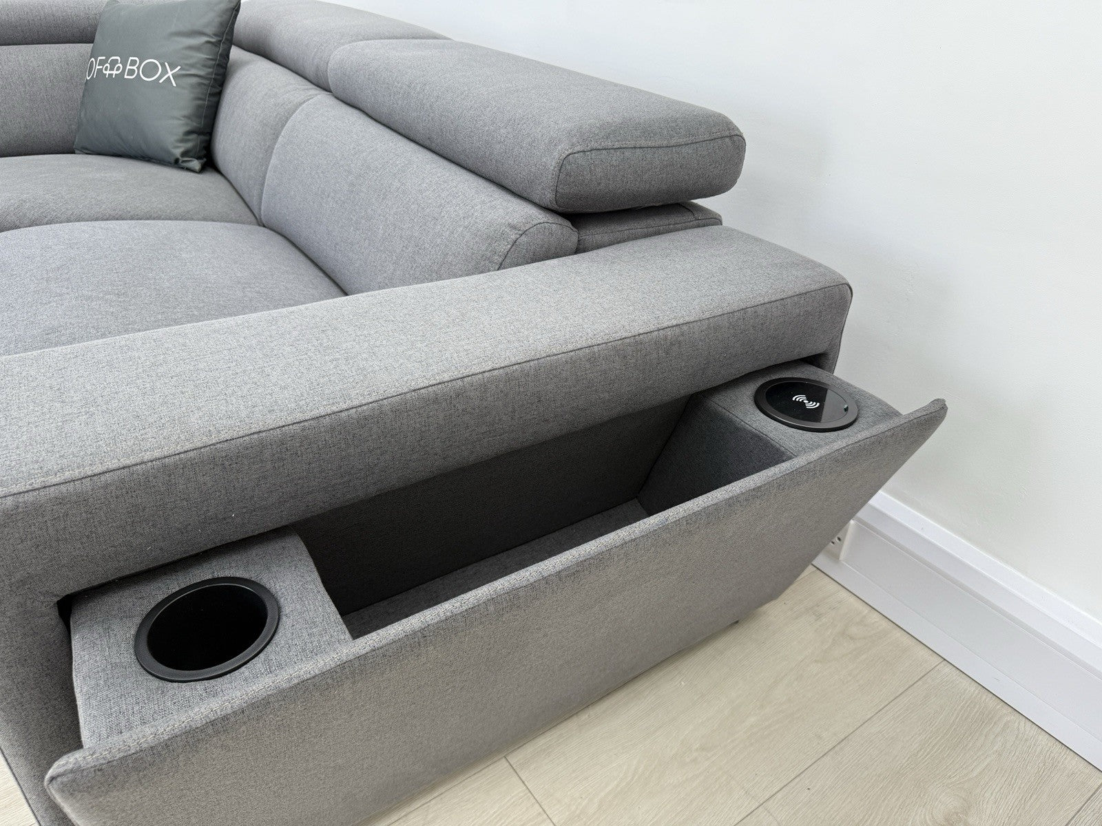 -Fold out storage arms with cup holders and wireless charging